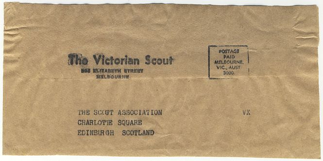 ![]() Unknown year, c. 1970?, Postage Paid cachet on piece of envelope or wrapper. The Victorian Scout, Melbourne, Vic. |