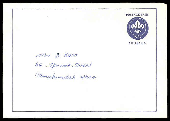 |   2008, Postage Paid imprint on envelope issued for the Scout Centenary. Issued by Scouts Australia (formal name is The Scout Association of Australia). |