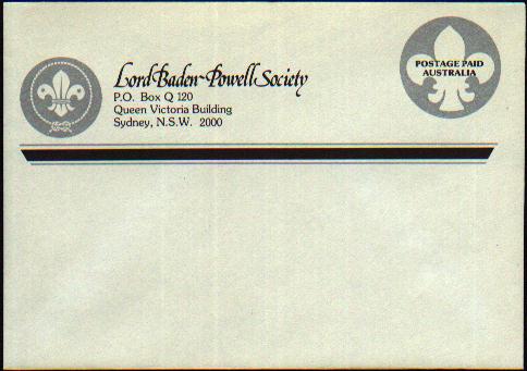 ![]() Unknown year, 1980's?, Postage Paid imprint on envelope. Lord Baden-Powell Society, Sydney, N.S.W. |
