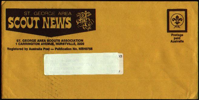 ![]() Unknown year, 1980's?, Postage Paid imprint on envelope. St. George Area Scouts Association, Hurstville, N.S.W. ![]() Unknown year, 1980's?, Postage Paid imprint on envelope. St. George Area Scouts Association, Hurstville, N.S.W. |