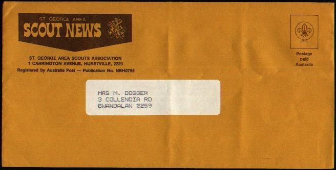 |  Unknown year, 1980's?, Postage Paid imprint on newsletter. The Scout Association of Australia, Port Kevela, N.S.W. |
