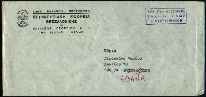 Unknown year, 1960's?, cachet "Central Post Office of Salonika / Postal Fee / Paid".