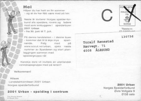 |  2000, postage paid imprint (License No. 171 210 373 Omd.). Used by Norges speiderforbund, Oslo (Norwegian Boy Scout and Girl Guide Association). Advertising postcard for the national Boy Scout and Girl Guide camp "Urban 2001". |