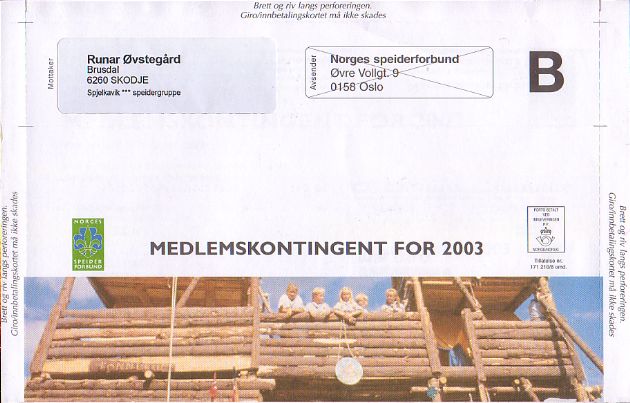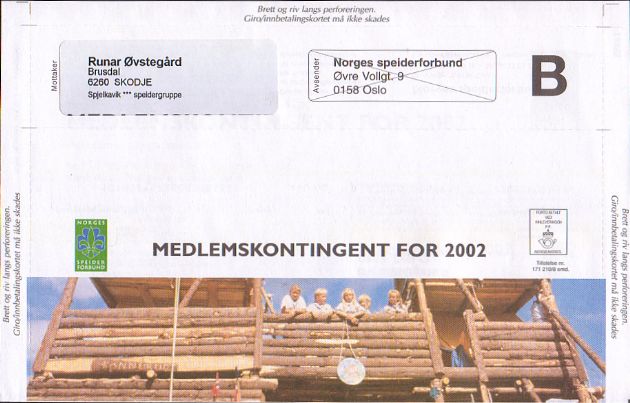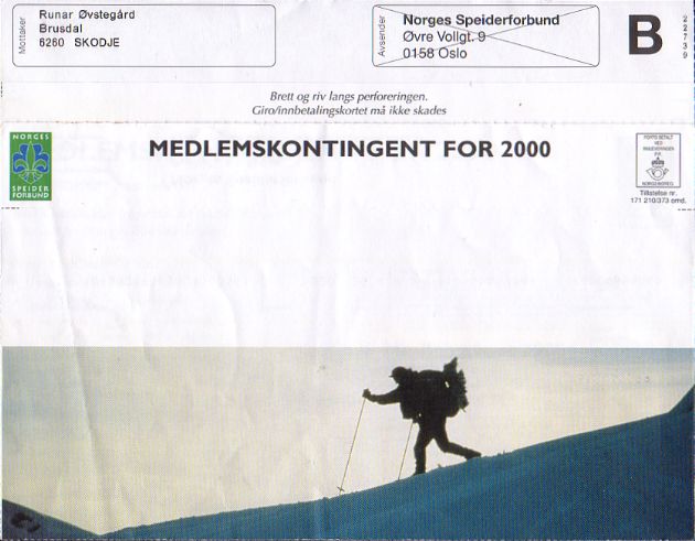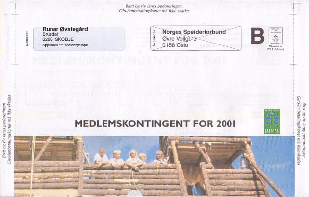 |  1999/2000, postage paid imprint (License No. 171 210/373 Omd.). Used by Norges speiderforbund, Oslo (Norwegian Boy Scout and Girl Guide Association). Form/invoice for annual membership fee, 2000.  2000/2001, postage paid imprint (License No. 171 210/8 omd.). Used by Norges speiderforbund, Oslo (Norwegian Boy Scout and Girl Guide Association). Form/invoice for annual membership fee, 2001.  2001/2002, postage paid imprint (License No. 171 210/8 omd.). Used by Norges speiderforbund, Oslo (Norwegian Boy Scout and Girl Guide Association). Form/invoice for annual membership fee, 2002.  2002/2003, postage paid imprint (License No. 171 210/8 omd.). Used by Norges speiderforbund, Oslo (Norwegian Boy Scout and Girl Guide Association). Form/invoice for annual membership fee, 2003. |