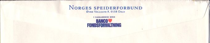 |   2001, imprint for mass mailing (front and reverse of envelope). Used by Norges speiderforbund, Oslo (National Boy Scout Association HQ, Oslo) in co-operation with Banco Fondsforvaltning (an investment broker), for mailing of brochures. The purpose was to sell "Human Fund" shares, from which the Scout association received 2% of the capital. |