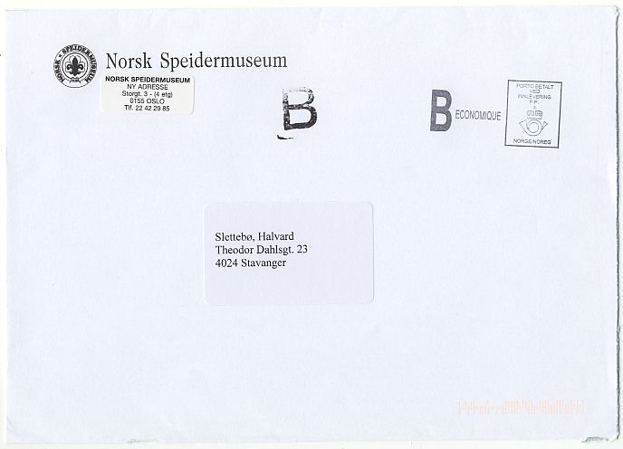 |  2008, postage paid cachet "Porto betalt ved innlevering P.P." (Postage paid at counter), on envelope from Norsk Speidermuseum, Oslo (Norwegian Scouting Museum). The cachet is used at post office for bulk mailings which are paid at the counter. |