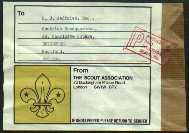 on piece (from parcel?) sent from The Scout Association, who moved from London to Lancing (Worthing) in 1974.