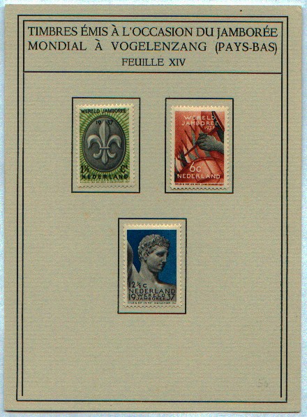 The delegation from the Netherlands had prepared a set of presentation cards with Dutch stamps issued in the late 1930s. 16 different cards in a specially printed cover or folder were handed out to the conference delegates. The three stamps of the 1937 World Jamboree set were affixed to card no. 14 in the set. The cover and the jamboree stamp card are shown below. The printed text on the cover and cards is in French, the official U.P.U. language.